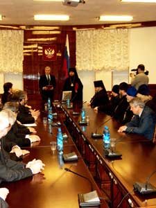 В овальном зале администрации Архангельской области, где произходило подписание документа, собрались духовенство города Архангельска, председатель областного собрания депутатов В.С. Фортыгин, руководители областных департаментов, мэры Архангельска и Северодвинска, представители общественности.