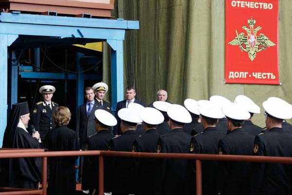 На церемонии присутствовали Президент РФ Дмитрий Анатольевич Медведев, министр обороны РФ Анатолий Эдуардович Сердюков, главнокомандующий ВМФ Владимир Сергеевич Высоцкий, генеральный директор – генеральный конструктор СПМБМ «Малахит» Владимир Николаевич Пялов, губернатор Архангельской области Илья Филиппович Михальчук, генеральный директор ОАО «ПО «Севмаш» Николай Яковлевич Калистратов, епископ Архангельский и Холмогорский Тихон, руководители г. Северодвинска, г. Архангельска и другие официальные лица.