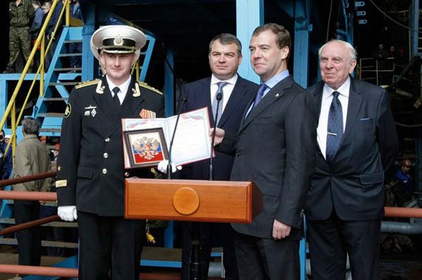 Выступая на торжественной церемонии, Дмитрий Анатольевич Медведев сказал: «Очень здорово, что эта лодка носит имя вашего прекрасного города. Новый крейсер – это пример эффективной реализации сложного и масштабного проекта. Конструкторы, рабочие предприятия, все, кто принимал участие в реализации проекта, блестяще справились с поставленной задачей. В скором времени будет утверждена программа развития военного и гражданского кораблестроения, и одно из ее направлений – это создание целой серии кораблей подобного крейсеру «Северодвинск»».