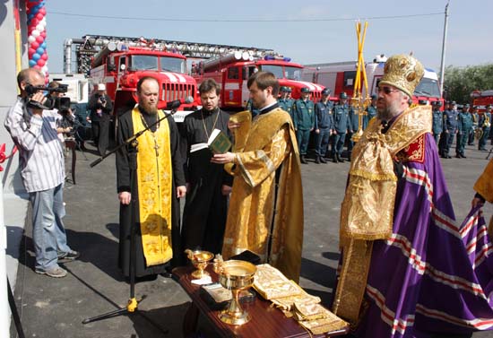 Перед торжественным открытием новой пожарной части Его Преосвященство совершил чин ее освящения.