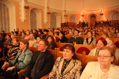 Со сцены звучали песнопения, посвященные Рождеству Христову. Первым выступил старший хор епархиальной воскресной школы (регент Екатерина Каркавцева). Постоянные зрители смогли отметить, как быстро растет мастерство маленьких исполнителей. В их репертуаре уже присутствуют сложные многоголосные произведения. Конечно, есть и красивые колядки. По стопам старших певчих идет и младший хор этой школы. Малыши (также под руководством Екатерины Каркавцевой) с удовольствием исполнили песенки про Рождество. А затем наступил черед сводного хора и общей песни - под аккомпанемент фортепиано, гитары, скрипки, флейты...