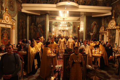 Вечером в Свято-Ильинском кафедральном соборе г. Архангельска архипастыри возглавили совершение всенощного бдения недели 37-й по Пятидесятнице и памяти блаженной Ксении Петербургской. Духовенство кафедрального собора сослужило святителям за праздничным богослужением.