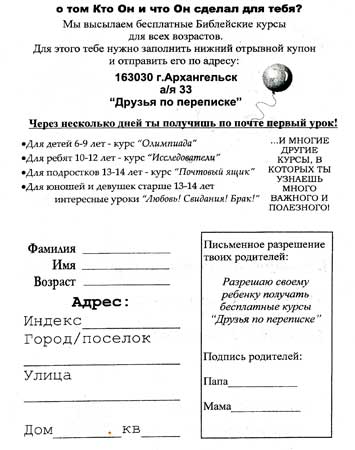 Несмотря на уверения организаторов акции «Ощути силу перемен» о том, что она имеет исключительно социальную направленность, тем не менее, во время акции происходит сектантская вербовка. Листовки с надписью «Приглашаем всех детей. Бесплатные заочные Библейские курсы для детей» члены сект раздают в кинотеатрах города после окончания фильма «Иисус». В приглашении на оборотной стороне - форма заполнения отрывного купона, который предлагается послать по адресу Архангельск, а/я … «Друзья по переписке». В купоне необходимо указать фамилию, имя возраст ребенка, полный адрес. В отдельной графе – «Письменное разрешение твоих родителей: Разрешаю своему ребенку получать бесплатные курсы «Друзья по переписке». Подпись родителей:...» Взрослых посетителей киносеансов ждет другое «интересное» предложение – посетить…. Клуб Всероссийского Общества глухих на улице Розы Люксембург, 78. По ложной скромности, видимо, организаторы не указывают, что именно там находится их штаб-квартира, в частности, секты-«запевалы» «Новое поколение». Очевидно, что и под видом таинственных «Друзей по переписке» выступают все те же организаторы акции.