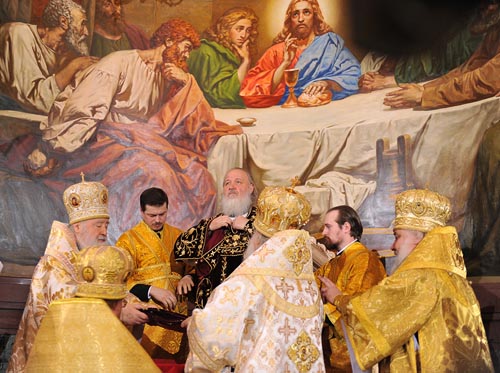Блаженнейший митрополит Киевский и всея Украины Владимир возгласил «Аксиос» (греч. «Достоин»). Ему многократно вторили священнослужители в алтаре, хоры Храма Христа Спасителя, Свято-Троицкой Сергиевой Лавры, Сретенского монастыря города Москвы, Никольского хора при Третьяковской галерее, а также все молящиеся.