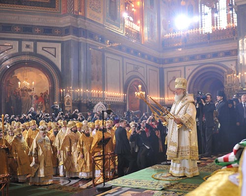 В соборном храме присутствовали Президент Российской Федерации Д.А.Медведев, Председатель Правительства Российской Федерации В.В.Путин, руководители и представители органов власти других государств на территории канонической ответственности Русской Церкви, представители инославных общин.