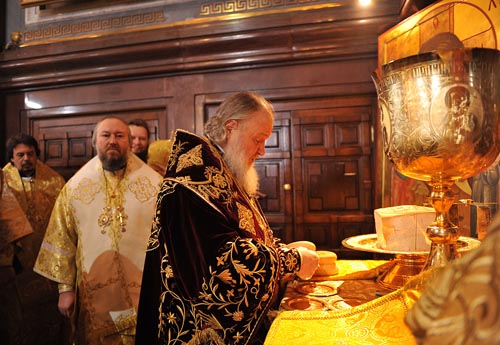 Его Святейшество обратился ко всем собравшимся в соборном храме с Первосвятительским словом, отметив, в частности: «Нет и не может быть в жизни Патриарха ничего личного, частного: он сам и вся его жизнь без остатка принадлежат Богу и Церкви, его сердце болит о народе Божием, особенно же о тех, кто отпал от церковного единства и кто еще не обрел веру. Патриаршее служение является особым духовным подвигом. Этот подвиг невозможно нести в одиночку или при поддержке ограниченного круга единомышленников. В этот подвиг через молитвенное общение и соборное делание вовлекается весь епископат, вся полнота Церкви со всем многообразием дарований, присущих ее членам. Посему, сознавая свое недостоинство, с большим внутренним трепетом восхожу я ныне на горнее патриаршее место, смиренно поручая себя молитвенному предстательству пред престолом Божиим моим святым предшественникам святителям Киевским и Московским».