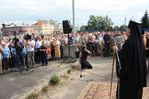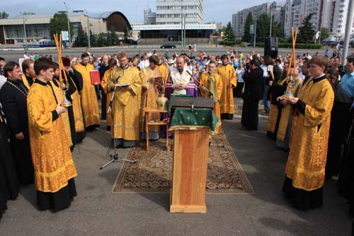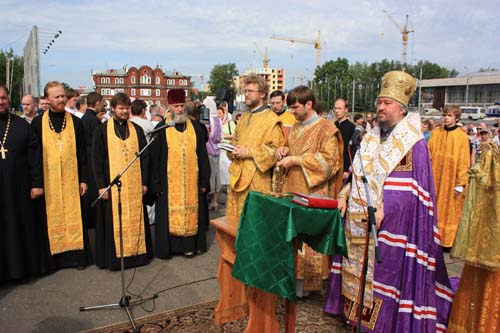 После совершения Литургии Его Преосвященство вместе с сослужившими ему священнослужителями, а также прихожанами Свято-Ильиского собора отправились на место строительства будущего Михаило-Архангельского кафедрального собора города Архангельска, где Владыка совершил молебен на начало всякого благого дела, открыв, таким образом, второй этап акции, направленной на приобретение жителями города и области строительных материалов, необходимых для возведения главного храма Архангельской и Холмогорской епархии – Михаило-Архангельского кафедрального собора.