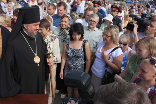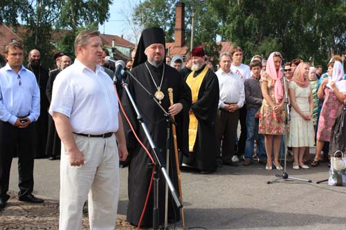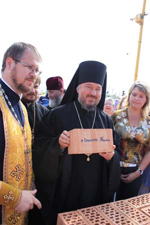 После совершения молебна Его Преосвященство поздравил всех присутствующих с праздничным воскресным днем – днем памяти пророка Божия Илии и поблагодарил всех, кто принял участие в открытии второго этапа строительства собора. «Хотелось бы, чтоб эта стройка дома Божия стала общенародной, чтобы мы все поучаствовали в этом святом и благом деле. Что значит вложить свой кирпич? Это значит, объединится всем миром – всем вместе, - отметил Владыка. - Это ли не акция объединения всех архангелогородцев независимо от социального статуса и занимаемых должностей? Все, кому не безразличен наш город, его будущее, его духовный климат, должны поучаствовать в этом святом деле». Также в своем слове Владыка выразил надежду, что в скором времени жители и гости города увидят восходящие стены соборного храма. Отдельные слова признательности Владыка выразил компании «Татнефть-Архангельск» и лично ее директору Дмитрию Львовичу Закатову за пожертвованную партию кирпича на строительство храма.