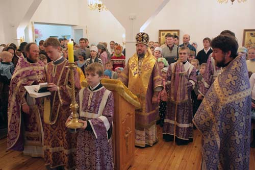 Перед началом уроков в школьном храме была отслужена праздничная Божественная литургия, возглавил которую епископ Архангельский и Холмогорский Тихон. Его Преосвященству сослужили духовник Епархиальной воскресной школы игумен Серафим (Степанов), клирик Свято-Алексеевского храма Епархиальной воскресной школы иерей Александр Калугин и клирик Свято-Ильинского кафедрального собора диакон Андрей Мезенцев. Своим пением праздничное богослужение украшали два хора: хор выпускников епархиальной воскресной школы, продолжающих посещать богослужения в школьном храме, и хор, состоящий из воспитанников школы 10-12 лет.